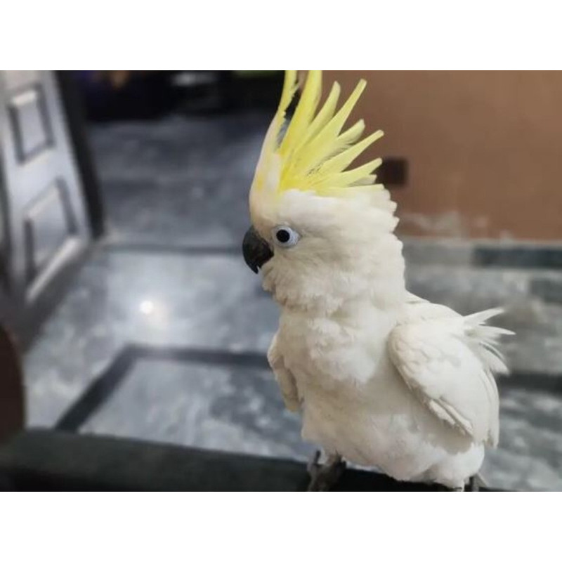 Le cacatoès à huppe jaune EAM (Élevé À la Main) est parfaitement adapté à la vie en famille. Très affectueux, il a besoin d’interactions quotidiennes, de jeux et de stimulation. Une grande volière ou une cage spacieuse est indispensable pour son bien-être, avec perchoirs solides, jouets, et un bac pour le bain.