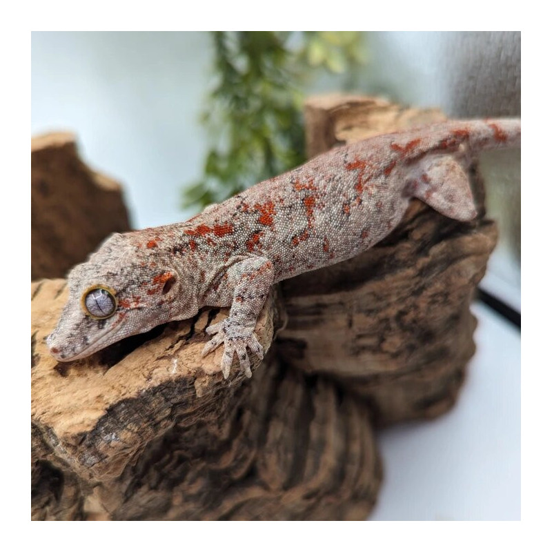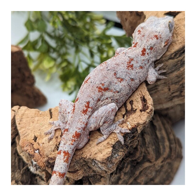 C’est un gecko gargouille à motifs rouges intenses, rare et très recherché par les passionnés.