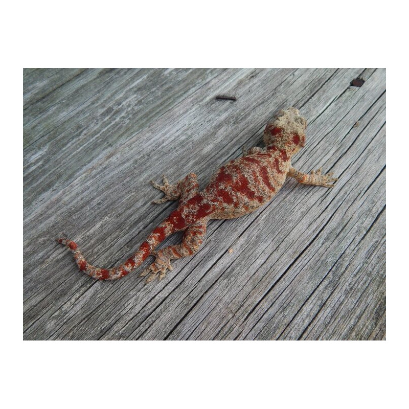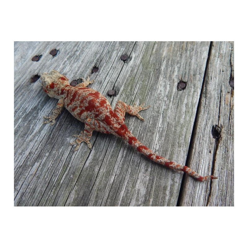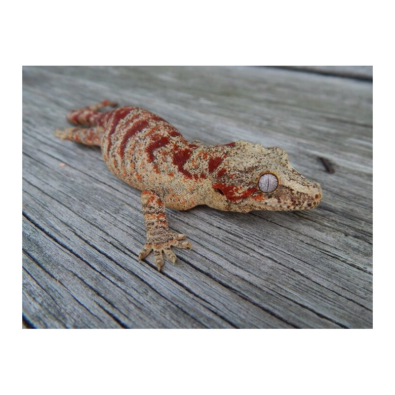 C’est un gecko gargouille à motifs rouges intenses, rare et très recherché par les passionnés.